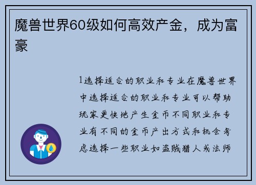 在魔兽世界中,选择适合的职业和专业可以帮助玩家更快地产生金币。不同职业和专业有不同的金币产出方式和机会。